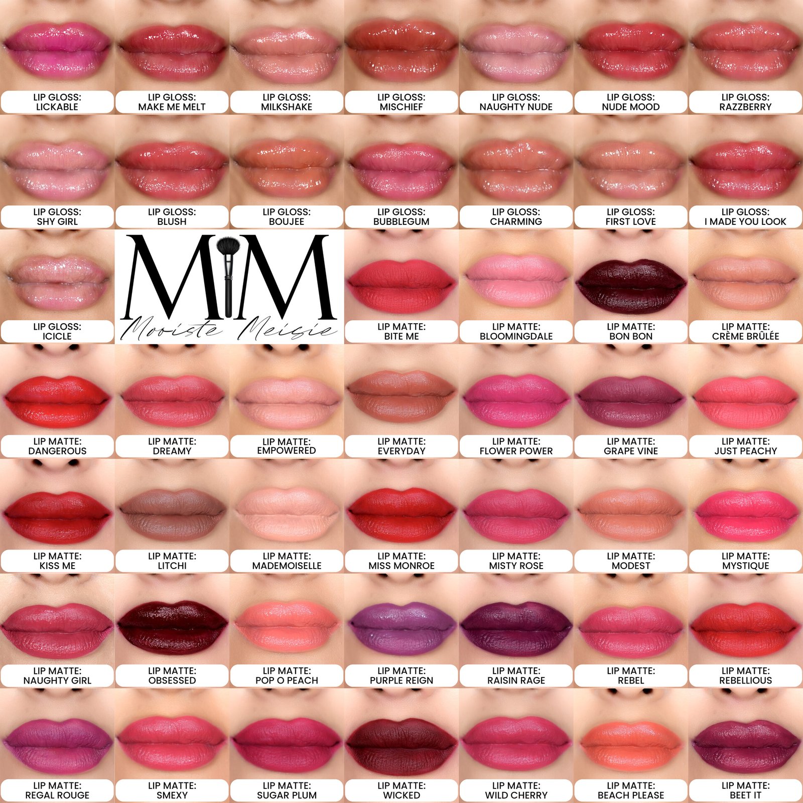 Lipmatte Empowered, Lipmatte Creme Brulee, Lipmatte Bloomingdale, Lipmatte Mystique, Lipmatte Rebel, Lipmatte Smexy, Lipmatte Dreamy, Lipmatte Just Peachy, Lipmatte Pop o Peach, Lipmatte Beach Please, Lipmatte Modest, Lipmatte Everyday, Lipmatte Litchi, Lipmatte Misty Rose, Lipmatte Flower Power, Lipmatte Naughty Girl, Lipmatte Regal Rouge, Lipmatte Wild Cherry, Lipmatte Sugar Plum, Lipmatte Grape Vine, Lipmatte Purple Reign, Lipmatte Beet It, Lipmatte Raisin Rage, Lipmatte Bite Me, Lipmatte Rebellious, Lipmatte Kiss Me, Lipmatte Dangerous, Lipmatte Miss Monroe, Lipmatte Wicked, Lipmatte Obsessed, Lipmatte Bon Bon, Lipmatte Mademoiselle