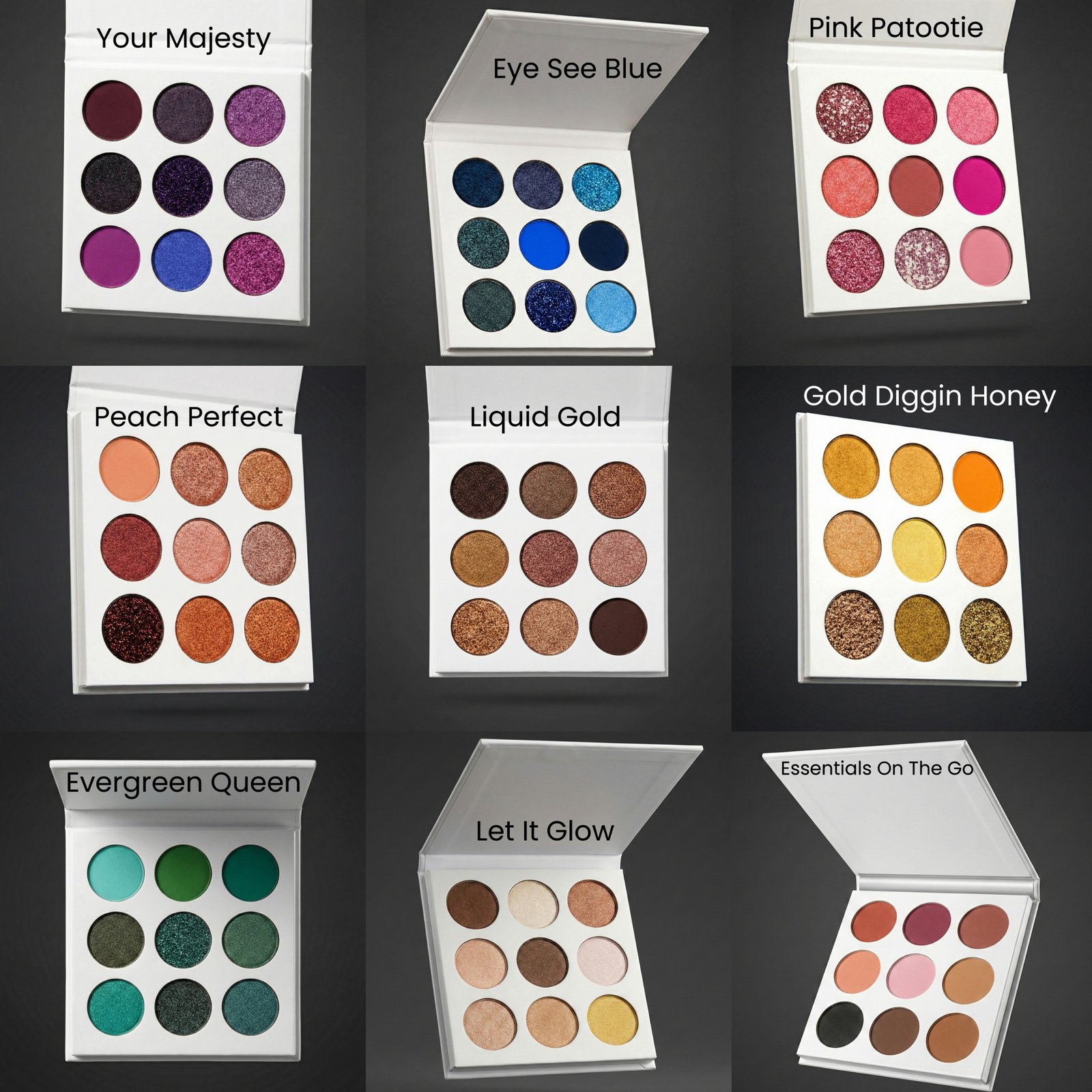 Eye See Blue, Your Majesty, Pink Patootie, Peach Perfect, Evergreen queen, Gold Diggin Honey, Liquid Gold, Essentials On The Go Matte Palette, Let It Glow Highlighter Palette